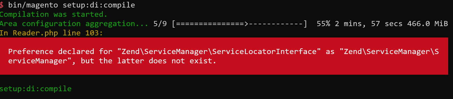 - as "Zend\ServiceManager\ServiceManager", but the latter does not exist» on `bin/magento setup:di:compile"