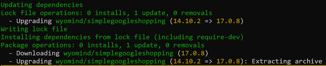 How did I upgrade the `Wyomind_SimpleGoogleShopping` module from 14.10.2 to 17.0.8?