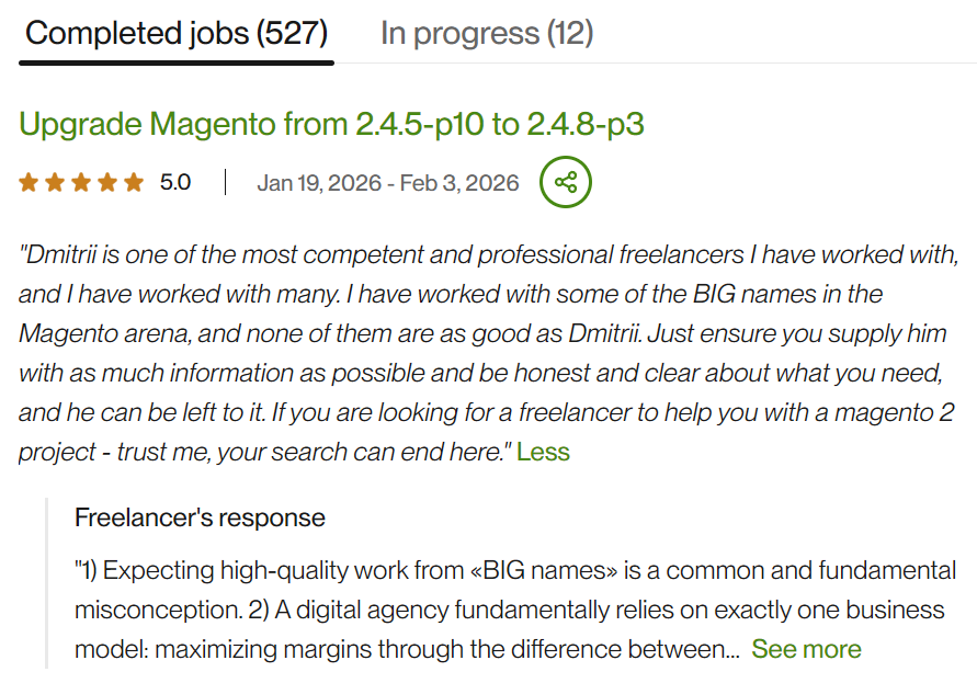 A client is unable to verify the «gold content» (the real expertise in Magento) before signing the contract and is forced to trust the «minting» (the brand).